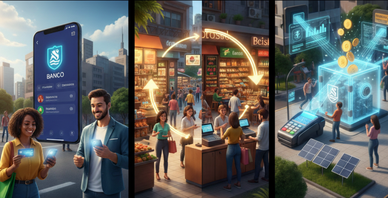 O primeiro passo foi tirar o poder dos grandes bancos e trazê-lo para casa. Foi criado um banco digital completo, com a marca e o brasão da cidade. Cada servidor e comerciante recebeu uma conta digital gratuita, segura e regulada pelo Banco Central. O impacto psicológico foi imediato: um sentimento de orgulho e pertencimento. O impacto prático foi fundamental: a criação de uma plataforma para o novo sistema.